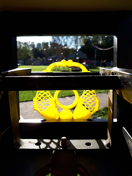 Installation is approximately 2 m wide and 3 meters high, made with found and donated materials.