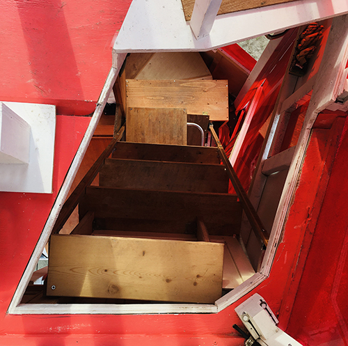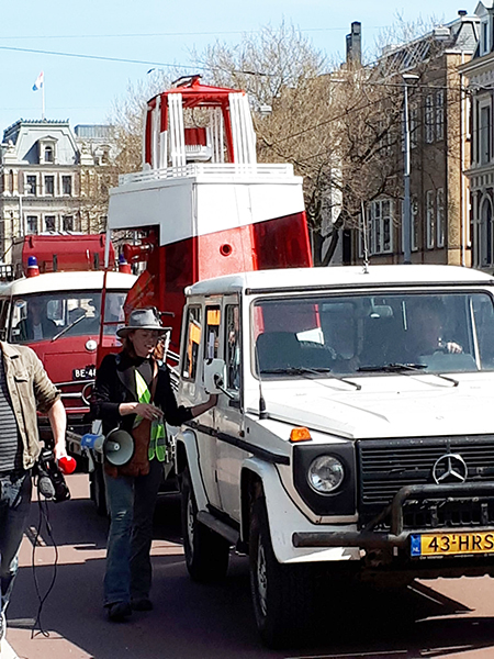 Eva Schippers built the command center of a lighthouse in 10 days for the cultural Stelling Amsterdam [CSA], using found and donated material. The lighthouse was part of a Kunst Corso, driving through the city of Amsterdam together with 12 other artists/initiatives to draw attention to getrification and cultural poverty of Amsterdam. An archaic object of emergency architecture, stationary and disused, is set in motion during the Korso. A city and a world where there seems to be no place for culture anymore, while it is precisely art that moves people, takes them along, shows a different side, encourages thinking, gives our lives meaning. A rogue beacon. During the tour, Eva Schippers invited Semna van Ooy [part of Culturele Stelling Amsterdam] and Tara Karpinsky [part of Pink Pont Express] to get in and have a conversation, overlooking the city. In the lighthouse, collected from cupboards, construction waste, household items, second-hand lamps and bathroom mirrors, the artist and her guests keep the lamp moving manually during the conversation. Let's keep moving!